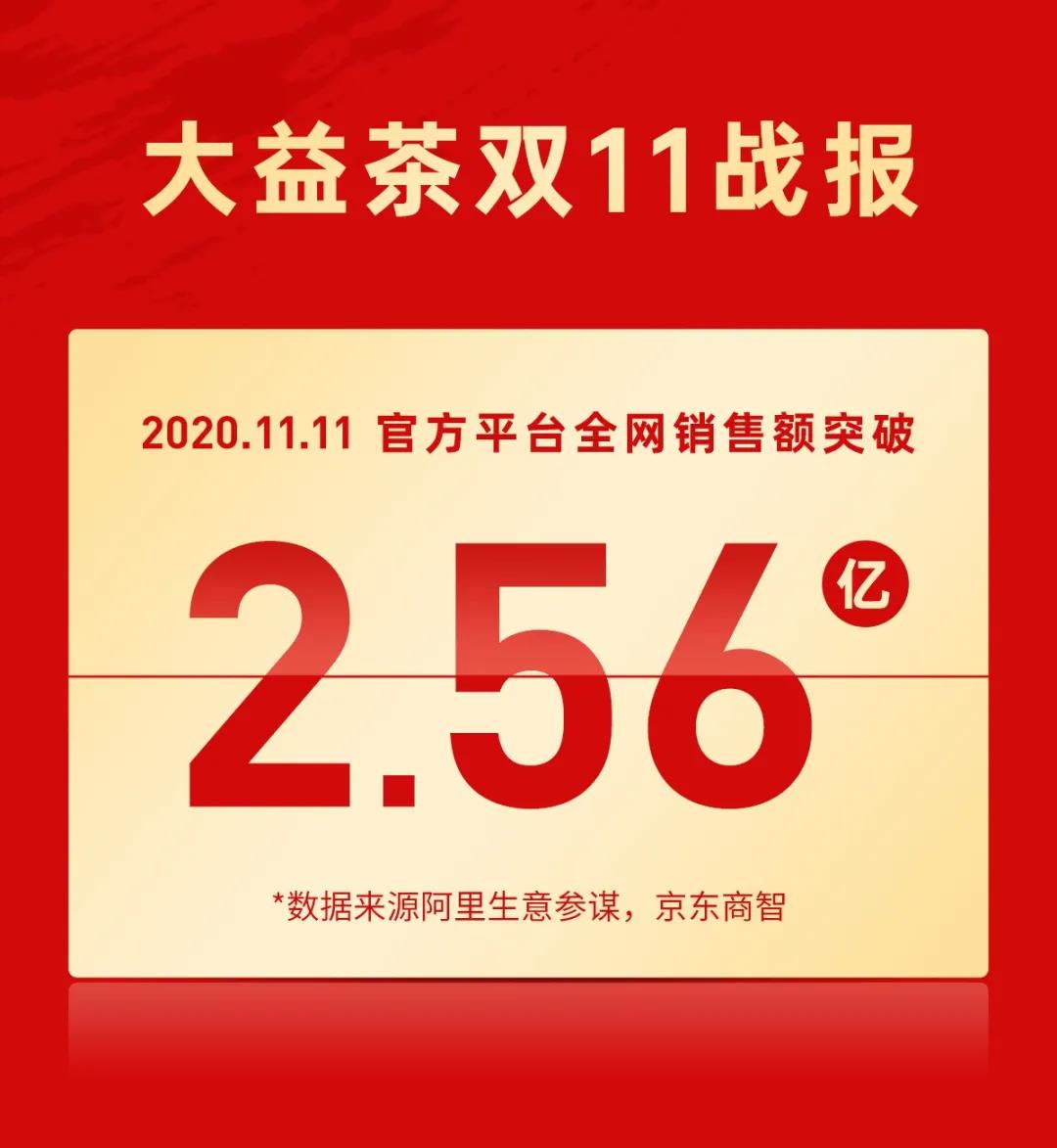 11月11日零點(diǎn),本年度雙11“大戰(zhàn)”結(jié)束,大益各項(xiàng)“戰(zhàn)績”出爐,再次刷新茶行業(yè)里程碑式記錄,大益茶官方平臺全網(wǎng)銷售額突破2.56億。其中,天貓大益茶葉旗艦店銷售總額超2.01億,大益榮登茶行業(yè)銷售六連冠。