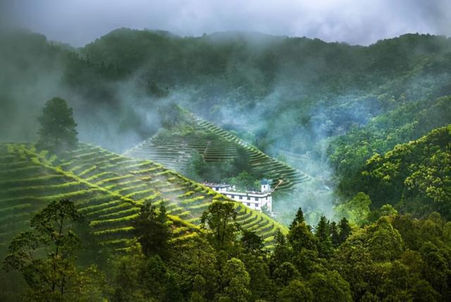 合水鎮(zhèn)鐵山茶場漫山遍野的茶樹沿著梯田整齊排列,煥發(fā)著勃勃生機(jī) 高訊攝