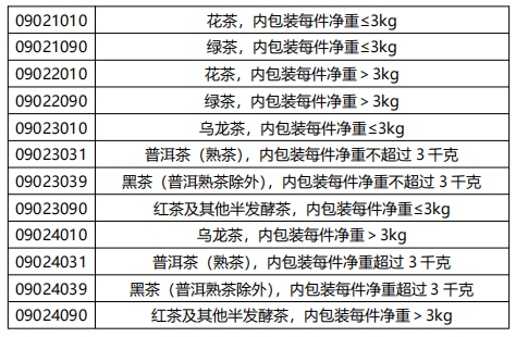 2020年12月,國務(wù)院關(guān)稅稅則委員會(huì)對茶葉類進(jìn)出口稅號(hào)進(jìn)行了調(diào)整,新增黑茶出口稅號(hào)類目,調(diào)整后茶葉進(jìn)出口商品編碼及商品名稱信息如下: