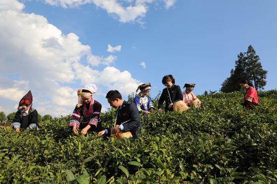 圖為普安縣稅務局干部積極服務 “貴州綠茶”第一采活動,向茶農宣傳惠農稅收優(yōu)惠政策,并同布依族群眾采摘新年的第一茬綠茶。謝昌明 攝